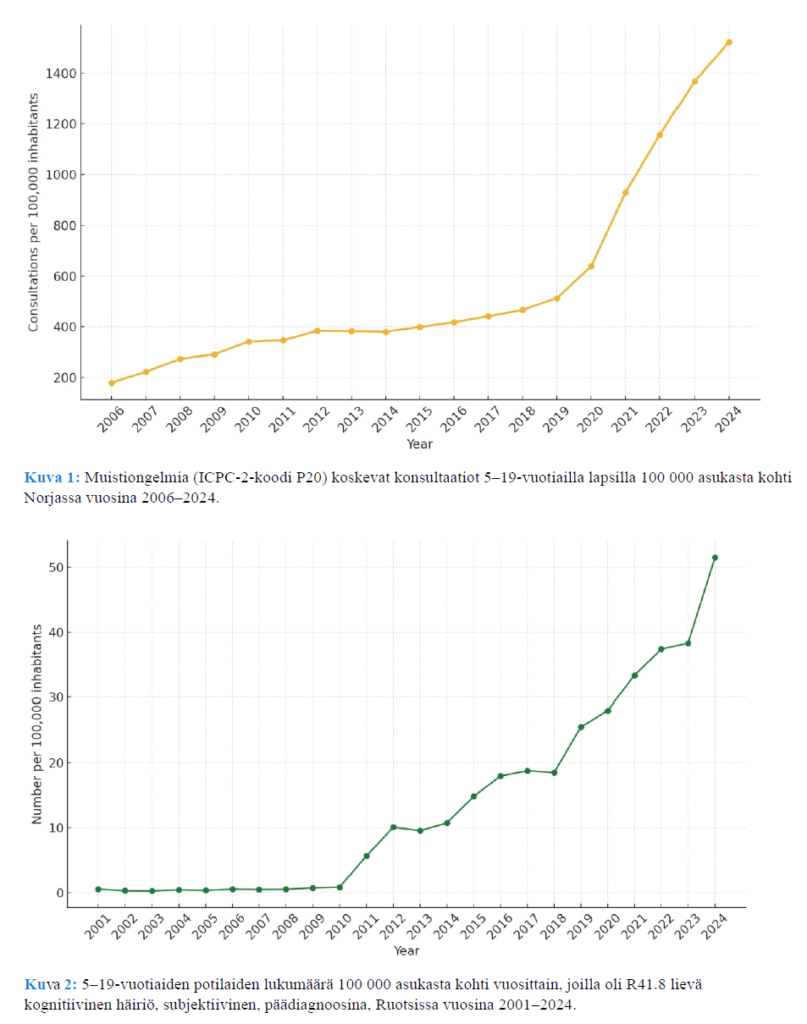in Sweden and Norway” on havaittu räjähdysmäistä kasvua lasten ja nuorten muisti- ja kognitiodiagnooseissa. Tutkimuksessa verrattiin kolmen Norjassa ja Ruotsissa käytetyn diagnostisen koodin (ICD-koodit: R41.3, R41.8 ja F06.7) määrän kasvua vuodesta 2001 vuoteen 2024. Nämä diagnostiset koodit annetaan todennettavan muisti- tai ajattelun/keskittymisen kyvyn alentumisen seurauksena. Kasvu em. diagnooseissa on ollut molemmissa maissa eksponentiaalista, Norjassa erityisesti vuodesta 2019 ja Ruotsissa jo vuodesta 2010.
