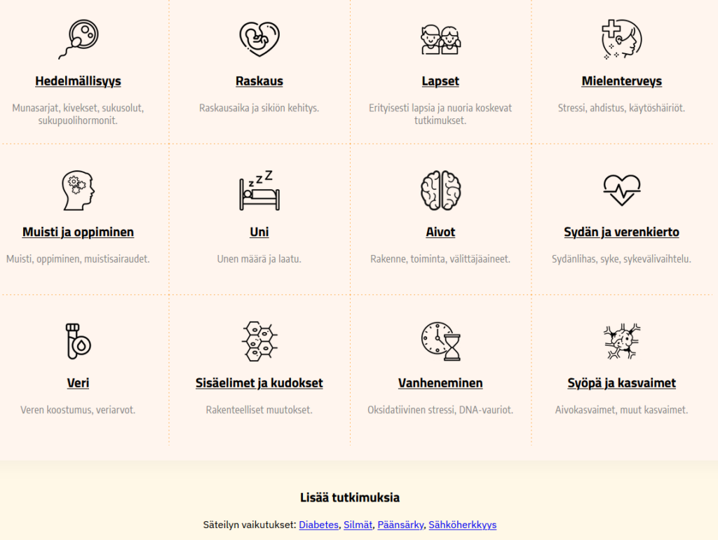 På sidan sateilytieto.fi finns vetenskapliga forskningsdata grupperad enligt följande områden: fertilitet, graviditet, barn, psykisk hälsa, minne och inlärning, sömn, hjärnan, hjärta och puls, blod, inre organ och vävnader, åldrande, cancer och tumörer, diabetes, ögon, huvudvärk, elöverkänslighet. Sidan är på finska och forskningen är på engelska.